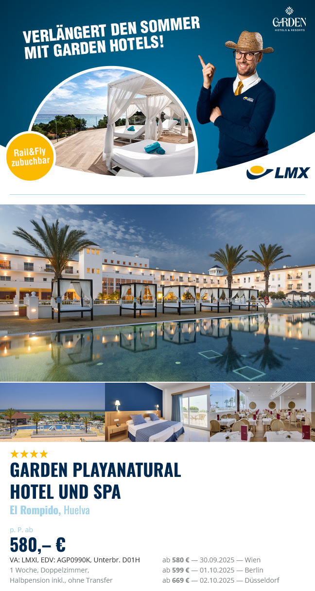 Once per week we send our popular B2B newsletter with offers and image promotion to our 9500 travel agencies in D-A-CH and in the Netherlands. (up to 5 hotels per newsletter)