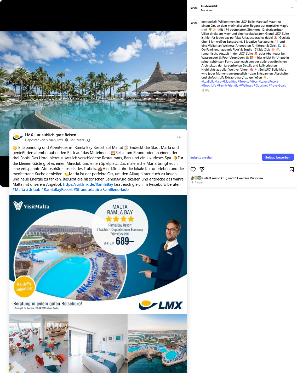 We will promote your destination and/or hotels through Facebook & Instagram posts/storys, individually like you wish.